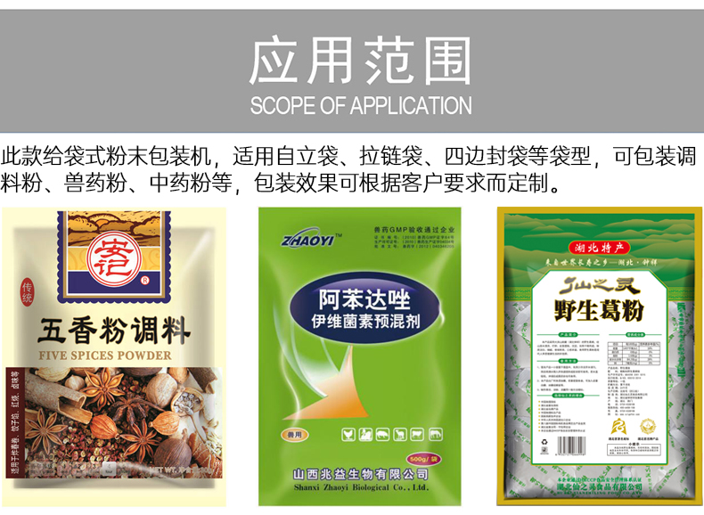 推薦搜索關(guān)鍵詞:給袋式包裝機(jī),給袋式粉末包裝機(jī),獸藥包裝機(jī),調(diào)料粉包裝機(jī),中藥粉包裝機(jī)